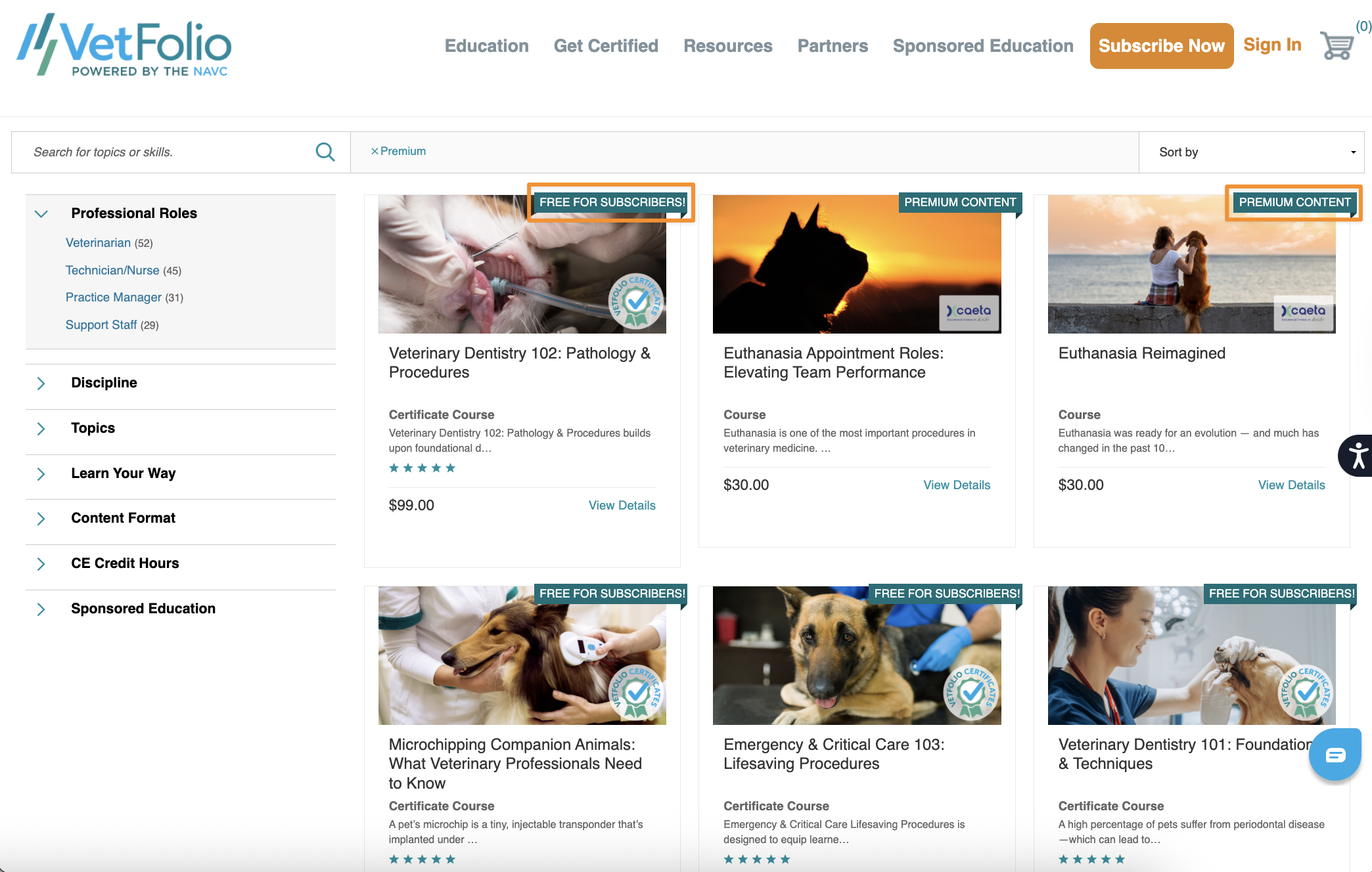 The majority of VetFolio's content catalog is included in the annual subscription. Some items, however, are a separate charge. These items can be purchased in addition a subscription, or independent of a subscription. Premium Content can be found here, or in the catalog. All items are clearly marked. If you wish to purchase premium content, log in to your dashboard, then locate the course and pay to enroll.