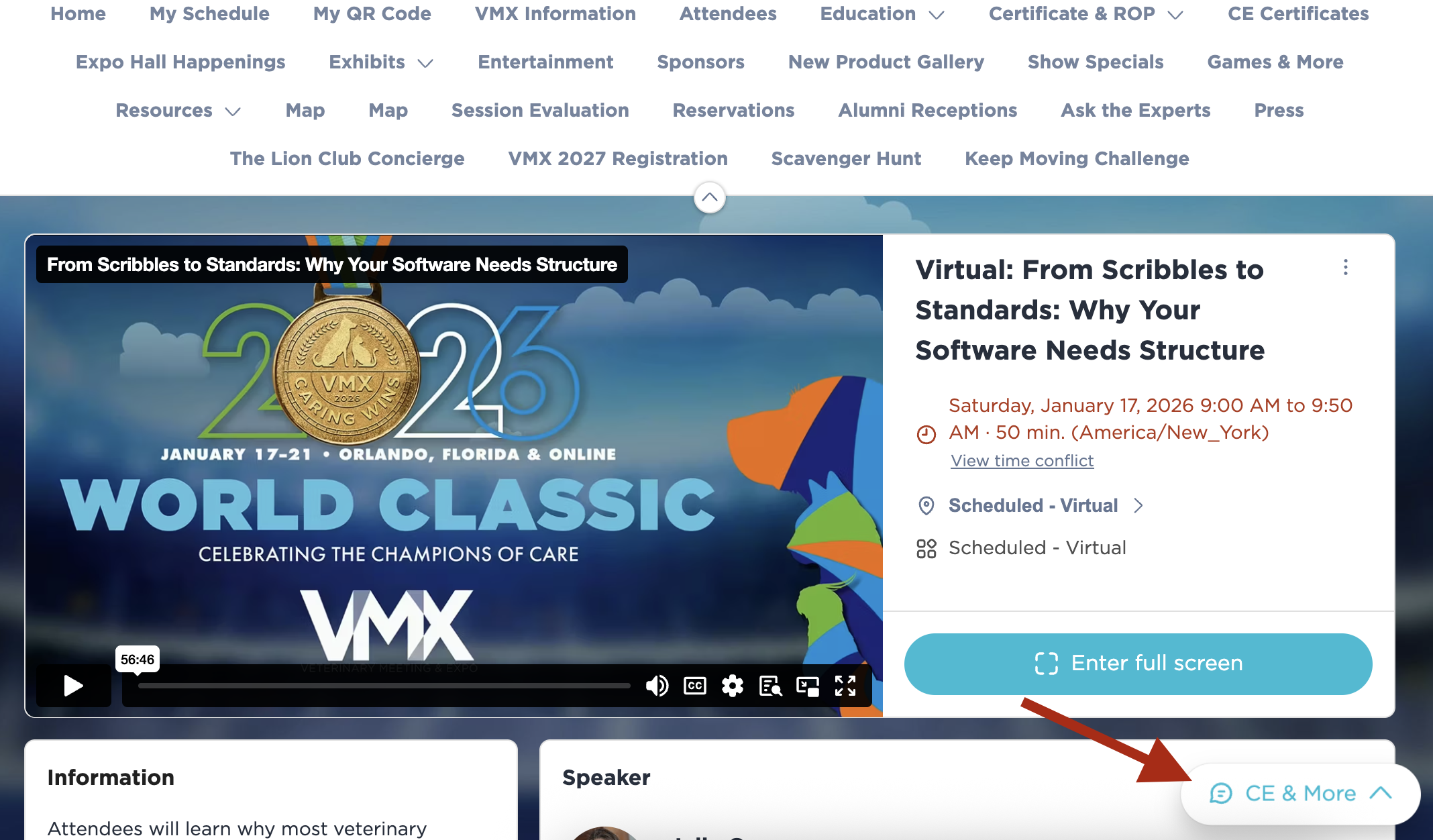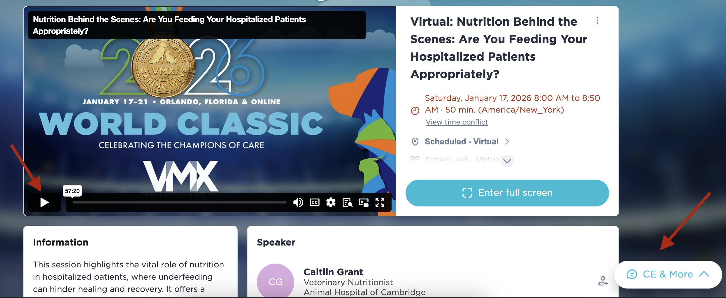 From here, you will click into the session you wish to view, watch the session, and then take the quiz to earn the CE.
