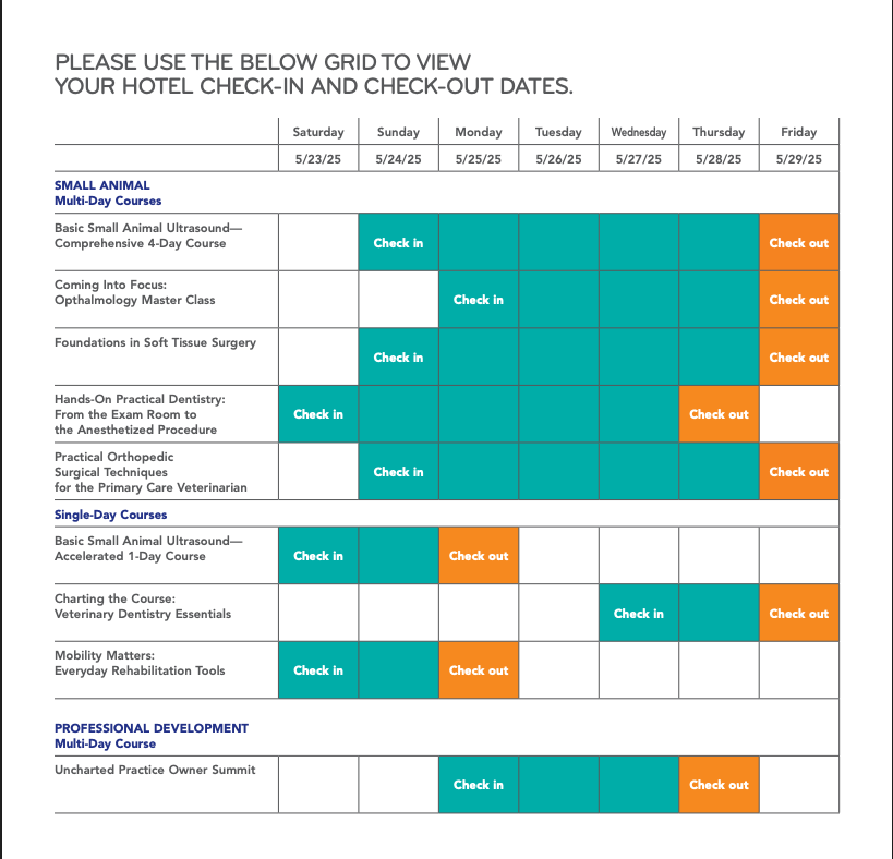 What hotel nights are included with my NAVC SkillShop Course? Modified on: Fri, 13 Feb, 2026 at 8:26 AM Your included hotel check-in and check-out dates will depend on the course you are attending. Please see the grid below for the included nights.