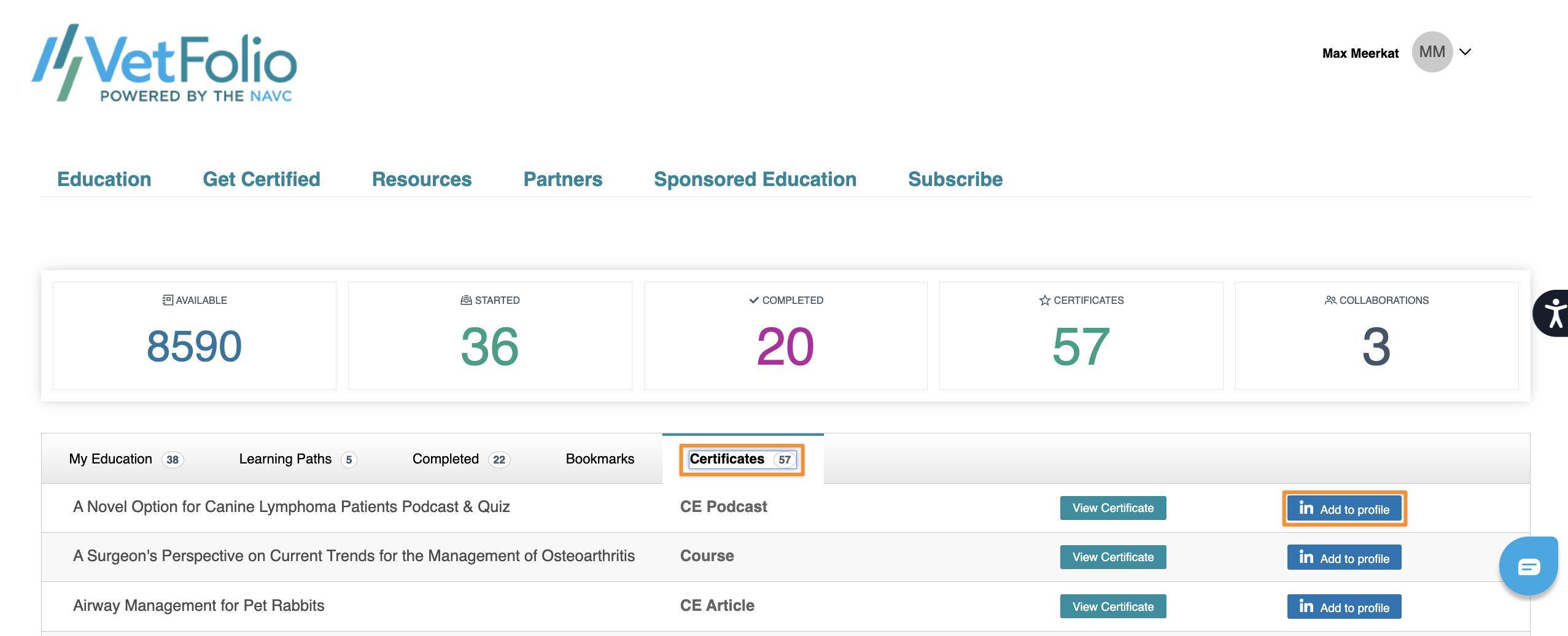 Yes, you can add any certificate you have earned to your LinkedIn profile. It will populate under the licenses and certifications portion of your LinkedIn profile. To add the certificate, you need to log into LinkedIn and VetFolio. Once on VetFolio, go to the "Certificates" tab on your Learner Dashboard and click the blue "add to profile button" pictured below.